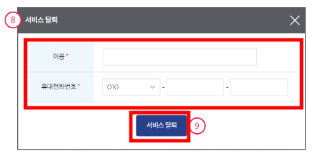 ⑨ 신청했던 이름, 휴대전화번호를 입력하면 서비스 탈퇴가 완료됩니다.
