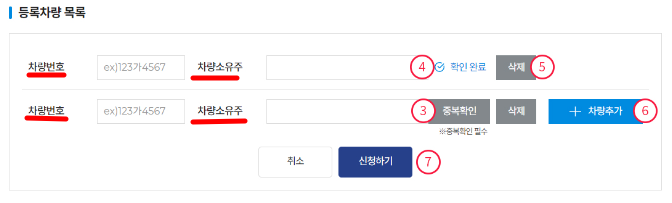 ⑥ [서비스 신청, 수정] > 차량 추가 버튼을 선택 시, 차량을 추가할 수 있는 영역이 추가됩니다.