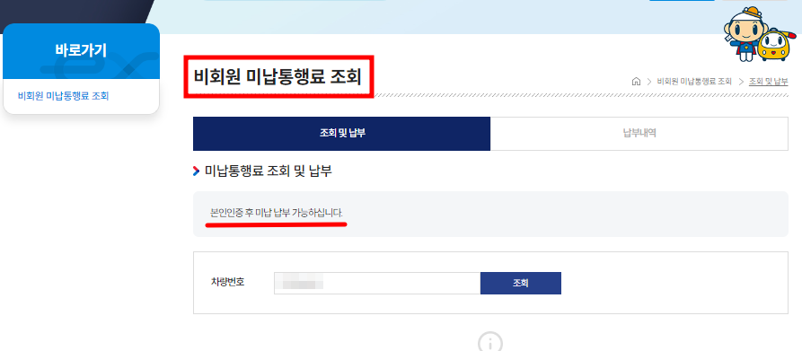 미납 조회를 통해 미납된 통행료가 확인되면 홈페이지에서 바로 납부할 수 있습니다. 이 경우 본인 인증 절차를 거친 후에 정상적으로 서비스를 이용할 수 있는데요 본인 인증을 마치면 미납된 통행료의 상세 내역도 함께 확인할 수 있어요.