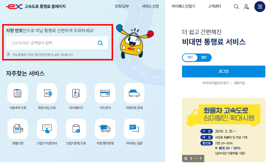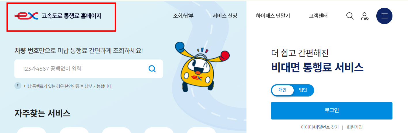 위의 바로가기를 통해 보다 편리하게 고속도로 통행료 홈페이지를 접속합니다.