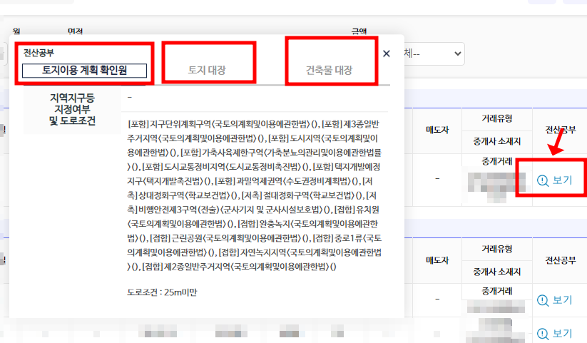 토지이용계획확인원, 토지대장, 건축물대장의 확인이 가능합니다.