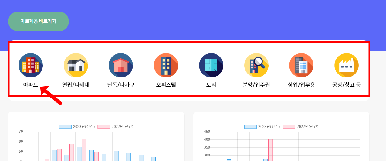 실거래가공개시스템에서는 조건별 자료도 제공됩니다. 각 부동산들의 종류별로 제공됩니다.