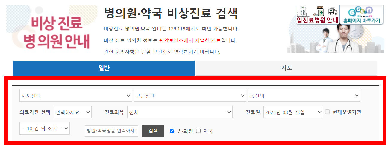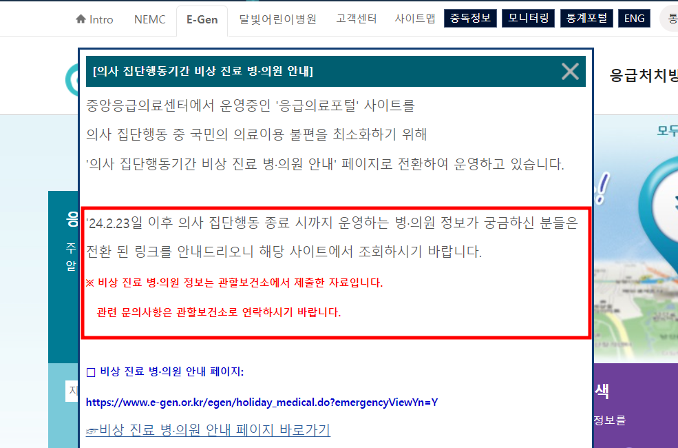 현재는 의사 집단행동 중 국민의 의료이용 불편을 최소화하기 위해 중앙응급의료센터에서 운영중인 '응급의료포털' 사이트를 '의사 집단행동기간 비상 진료 병·의원 안내' 페이지로 전환하여 운영하고 있습니다.