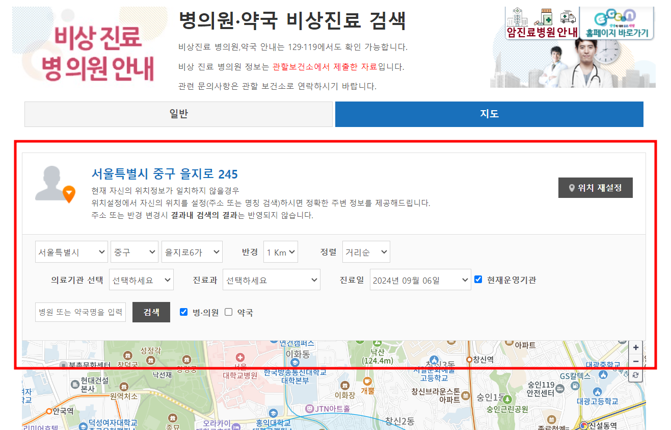 지도 위치 기반 비상진료 병의원 안내 살펴봅니다.