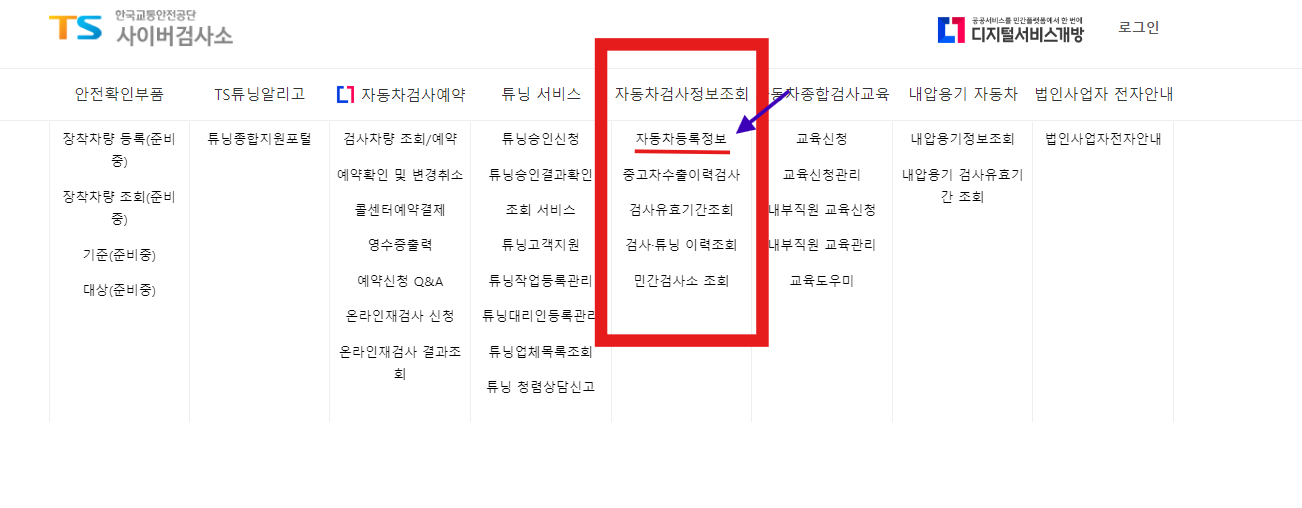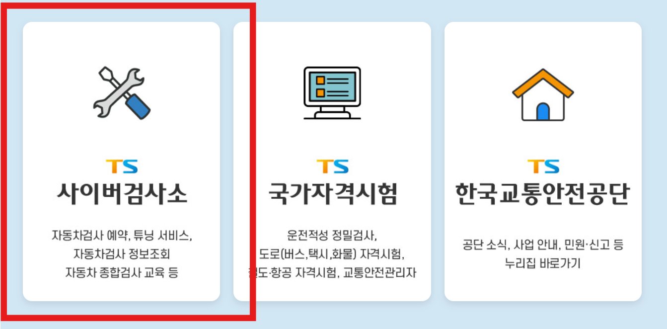 1. 한국교통안전공단에 접속하여 페이지 상의 좌측 TS사이버검사소를 클릭합니다.