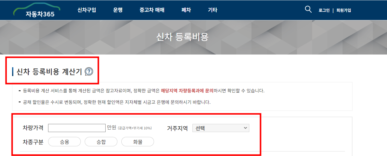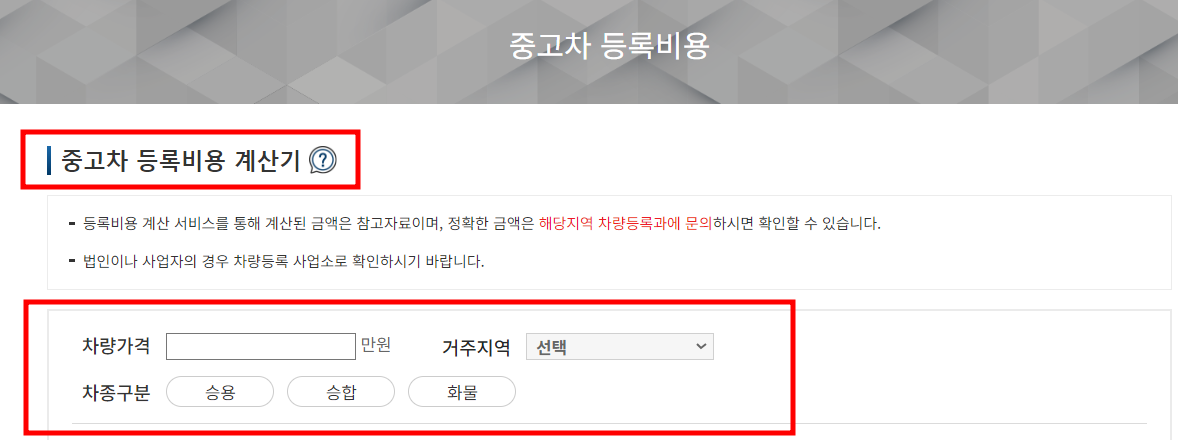 바로가기를 통하여 중고차 등록비용계산기에 들어가시면 아래와 같은 페이지를 만나실 수 있습니다.