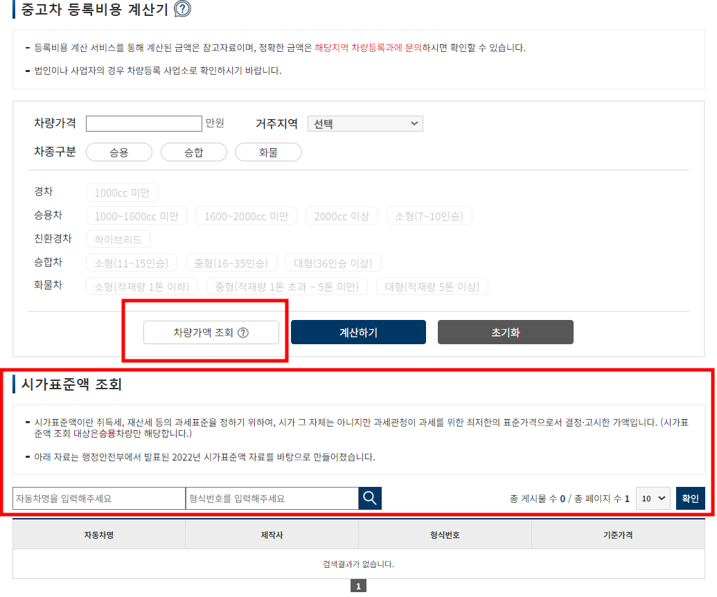 중고차등록비용계산기 하단의 차량가액조회를 확인하시면 아래로 시가표준액 조회를 확인하시게 될겁니다.