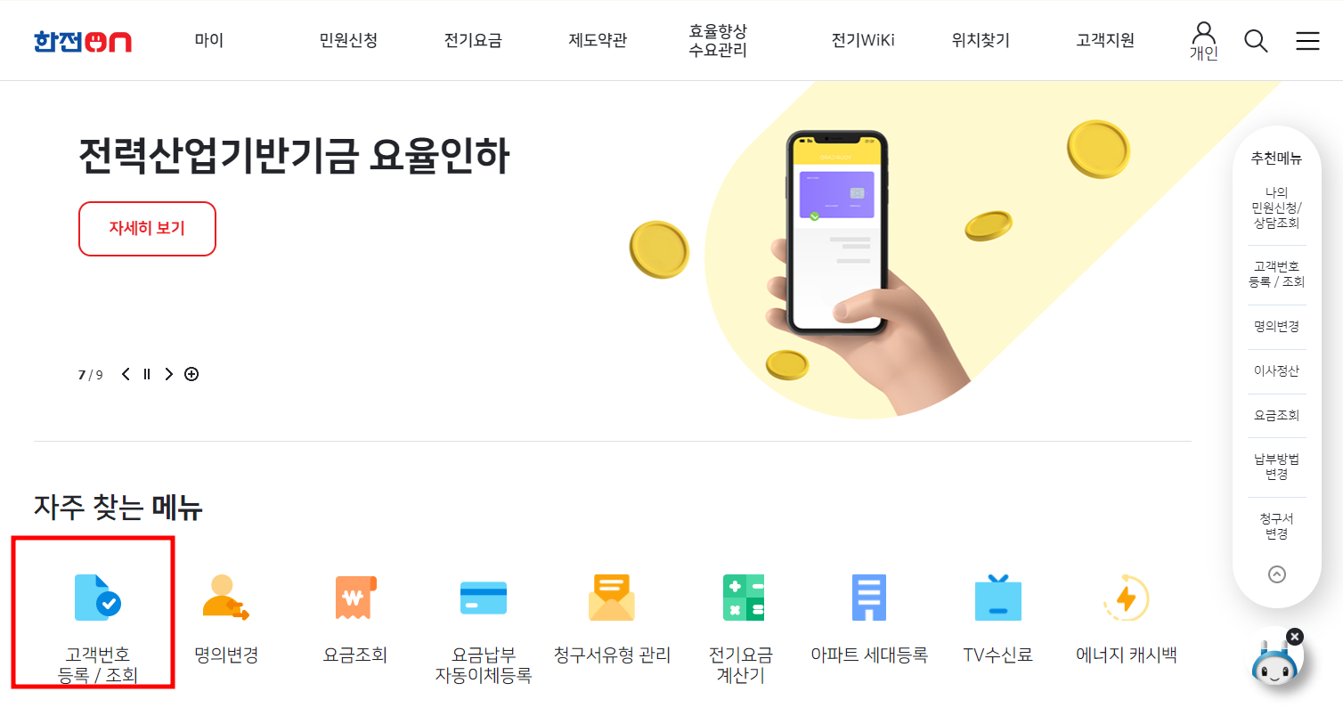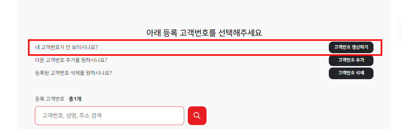 >> 홈페이지 접속합니다. 하단에 자주찾는 메뉴아래 고객번호 등록/ 조회 탭이 있는 것을 찾으실겁니다.