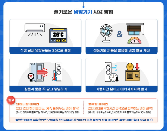 1.냉방기기의 실내 적정 온도를 26도로 설정합니다.