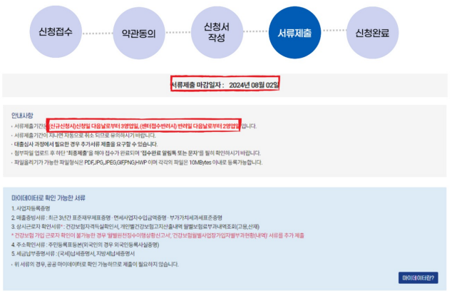 >> 제출서류 마감일자를 확인합니다. 서류 제출 기한은 신규신청인 경우 신청일 다음날부터 3영업일 이내입니다. 만약 제출한 서류가 반려되면 반려일의 다음 날부터 2영업일 내에 보완하여 다시 제출해야 합니다. 마감일을 지나면 신청 접수 단계부터 다시 진행해야 하므로 기한을 놓치지 않도록 주의 깊게 챙기시기 바랍니다.