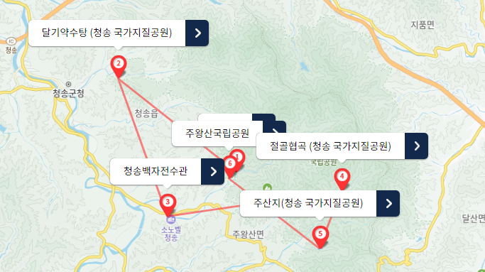 대전사를 시작으로 달기약수터(청송국가지질공원)-청송백자전수관-절골협곡(성송국가지질공원)-주산지-주왕산에 이르는 짧지 않은 코스지만 다 다닐 필요 없이 가시고 싶은 곳을 다녀오세요^^