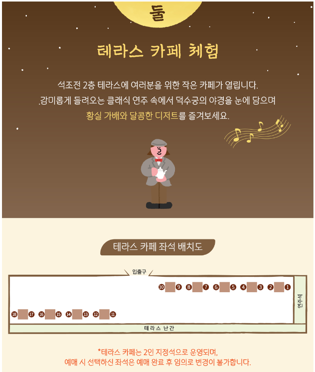 - 테라스 카페는 2인 지정석으로 운영되며, 예매 시 선택하신 좌석은 예매 완료 후, 임의로 변경이 불가능합니다.