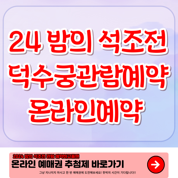 2024년 덕수궁 밤의 석조전은 조선시대 궁중의 멋과 아름다움을 전하며 많은 이벤트가 함께 합니다. 자세한 사항은 아래에서 설명하고 간단한 안내부터 하도록하겠습니다. 2024 밤의 석조전은 우선 우천 시에도 취소 없이 운영됩니다. 변동 사항은 문자로 안내된다하니 예매 전 티켓링크 회원정보의 연락처를 꼭 확인해 주세요. 덕수궁은 주차가 불가능하므로 대중교통 이용을 권장합니다. 지하철 시청역 1호선 2번 출구 또는 2호선 12번 출구를 이용하시면 됩니다.