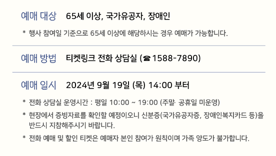 - 전화 예매: 2024년 9월 19일(목) 14:00 ~