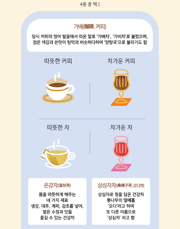 - 가배(咖啡, 커피): 당시 커피의 영어 발음에서 따온 말로 ‘가배차’, ‘가비차’로 불렸으며, 검은 색감과 쓴맛이 탕약과 비슷하다 하여 ‘양탕국’으로 불리기도 함. (따뜻한 커피 / 차가운 커피 중 선택 가능)