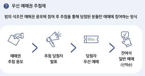 밤의 석조전 예매권 응모에 참여 후 추첨을 통해 당첨된 분들만 예매에 참여할 수 있는 방식입니다.