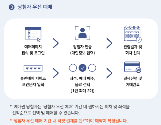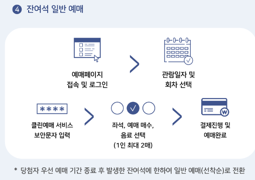 - 예매페이지 접속 및 로그인 → 당첨자 인증(개인정보 입력) → 관람일자 및 회차 선택 → 클린예매 서비스 보안문자 입력 → 좌석, 예매 매수, 음료 선택(1인 최대 2매) → 결제 진행 및 예매 완료