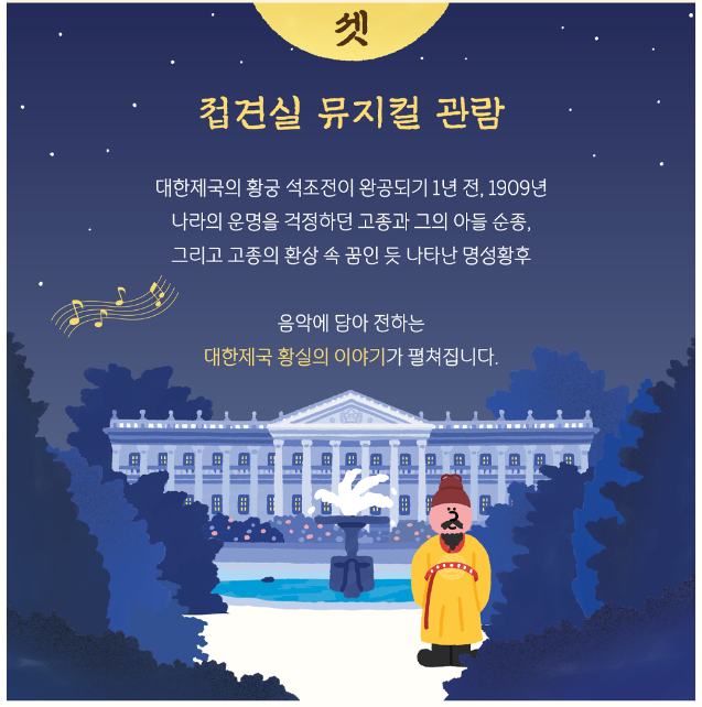 해설사의 이야기와 석조전 2층의 테라스에서 가배와 디저트는 잊지못할 추억을 선물할 것입니다. 고종의 꿈을 노래하는 창작 뮤지컬이 석조전에서 펼쳐집니다. 덕수궁에서 대한제국의 어느 날로 돌아간 듯한 꿈같은 밤을 함께 경험해보세요.