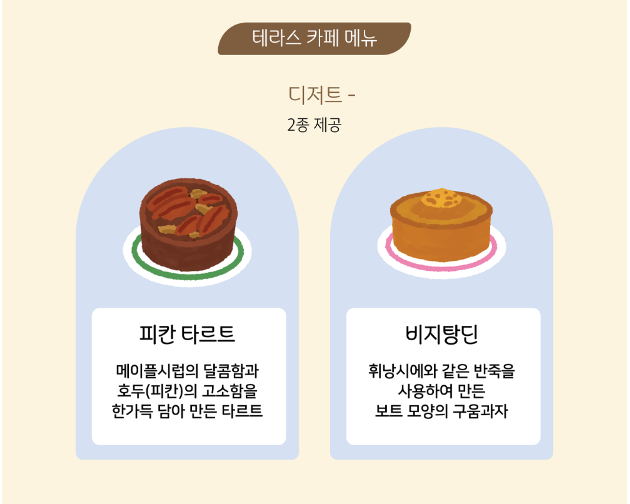 - 피칸 타르트: 메이플시럽의 달콤함과 호두(피칸)의 고소함을 한가득 담아 만든 타르트입니다.