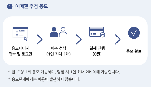 - 응모페이지 접속 및 로그인 → 매수 선택(1인 최대 1매) → 결제 진행(0원) → 응모 완료