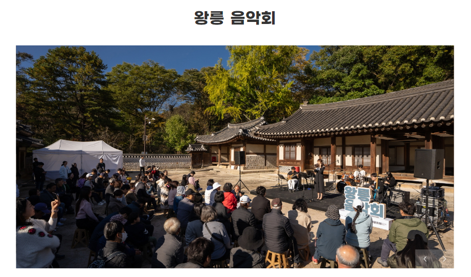 왕릉음악회에서는 조선왕릉 4곳(홍릉·유릉, 동구릉, 광릉, 영릉(세종대왕릉))에서 전통과 현대가 어우러지는 특별한 음악 공연이 펼쳐집니다. 각 왕릉마다 독특한 주제로 관객들의 가을 감성을 자극할 예정이며 별도의 예약 없이 현장에서 무료로 관람할 수 있어 누구나 쉽게 참여할 수 있는 기회를 제공합니다.