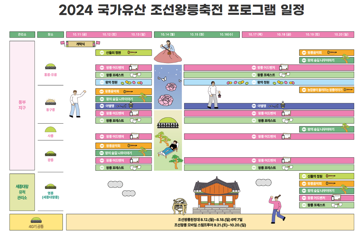- 예약 일정: 9월 20일 오후 2시부터 티켓링크에서 선착순 예약. ‘신들의 정원’, ‘동구릉 야별행’, ‘왕릉 포레스트(ForRest)’ 등은 사전예약이 필요한 유료 프로그램