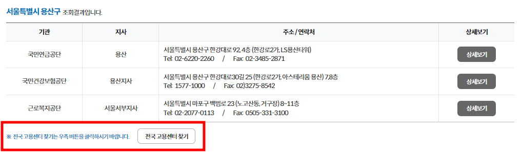 전국고용센터찾기를 원하신다면 상세 검색 페이지 하단의 전국고용센터찾기를 확인하시면 바로 연결이 되어 있습니다.