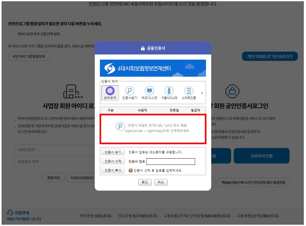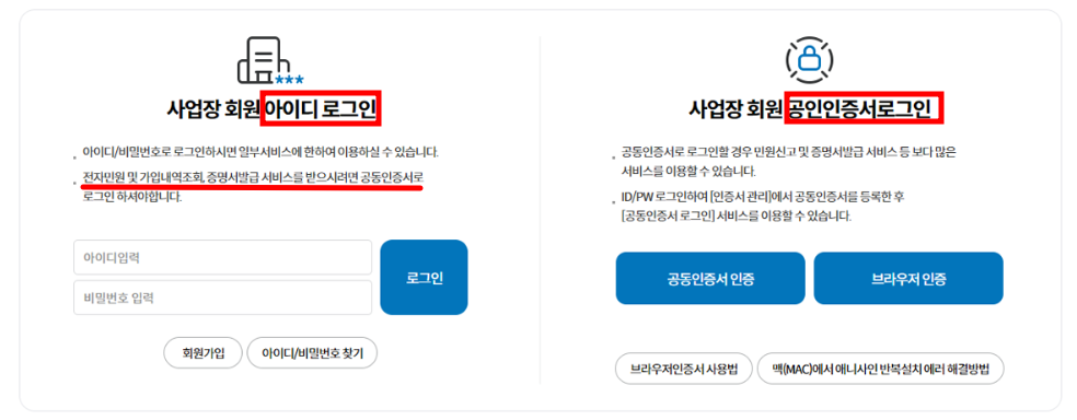 사업장 회원의 경우 전자민원의 가입내역조회, 증명서 발급을 받으시려면 아이디 로그인이 아닌 공인인증서로그인을 통해 홈페이지에 접속하셔야 원하시는 서비스를 원활하게 이용이 가능하십니다.