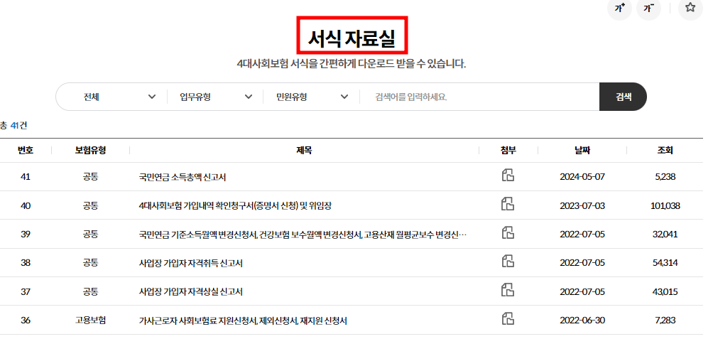 4대사회보험정보연계센터의 자료실의 서식자료실에는 국민연금 소득총액 신고서, 사업장 가입자 자격취득 신고서, 사업장 가입자 자격상실 신고서, 근로내용 확인신고서, 사업장 탈퇴 신고서 등 약 40여 건의 관련 서식을 다운로드할 수 있습니다.