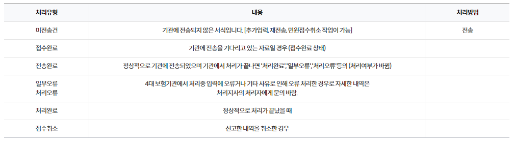 답변2 오류의 경우 두가지가 있습니다. 1.현재 포털사이트에서의 취득 등록시 오류일 경우 (홈페이지 자체 오류로 확인-전송 버튼을 누르지않았을 경우) 다시 한번 신고내용 및 전산문제를 확인하시고 문제가 없을시 헬프데스크(☏ 063-711-7800)로 연락하셔서 원격지원 등 도움을 받으시길 바랍니다. 2. 신고 진행, 완료 후 처리결과가 오류인 경우('전체오류' 또는 '일부오류') 저희 포털사이트에서 피부양자 취득 신고를 하시면 건강보험공단에서 신고서 처리 후 저희 4대사회보험 사이트에 처리결과를 수신 받아 보여드립니다. 저희 사이트는 접수 및 처리결과에 대한 조회만 가능하며, 실제 처리는 보험을 담당하는 건강보험공단에서 이루어집니다. 홈페이지 상단 ( 민원신고-민원처리현황조회 )에서 신고서 상세보기하여 접수현황 및 처리결과를 확인하실 수 있습니다. Tip. 피부양자 관련 가장 많이 문의하는 오류 - 첨부서류 관련 해당 오류에 대한 상세한 설명을 원하시면, 피부양자 자격취득신고서를 처리한 국민건강보험공단(☏ 1577-1000)에 연락하셔서 처리결과에 대한 정확한 안내를 받으시길 바랍니다.