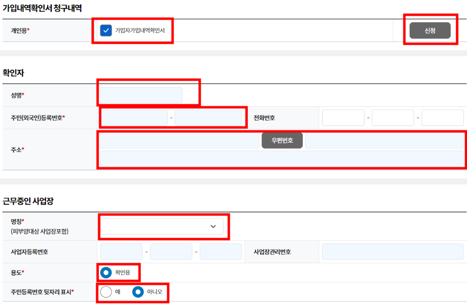 사업장 회원이 증명서를 발급받을 때 [확인대상자] 정보로 사업장 대표자의 성명과 주민등록번호가 자동으로 표시됩니다. '다른 기관 제출용' 4대사회보험 가입내역 확인서가 필요하다면 4대사회보험 인근 지사(국민연금공단, 국민건강보험공단, 근로복지공단) 창구에서 직접 발급 신청할 수 있습니다. 또한 [사업장 가입자 명부]는 가입자가 300인 초과인 경우 시스템 부하로 인한 처리 오류가 발생할 수 있으므로 해당 기관에 문의하여 직접 발급 받는 것이 좋습니다.