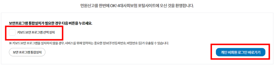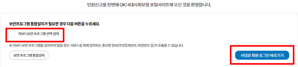 사업장 회원의 경우도 보안프로그램을 설치 후 사업장 회원 로그인 바로가기를 통해 회원로그인을 하시면 됩니다.