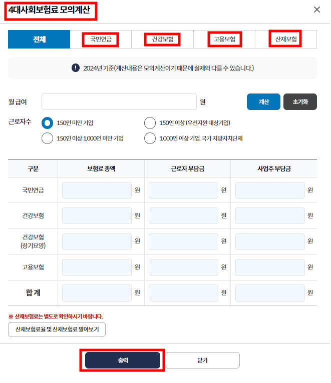 4대사회보험료인 국민연금과 건강보험 고용보험 산재보험의 보험료 총액과 각각의 부담금을 확인할 수 있습니다. 가장 최신의 법령을 기준으로 모의계산 되어지는 것이지만 실제와 다를 수 있음에 유의하시어 참고자료로 활용하시기 바랍니다.